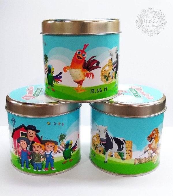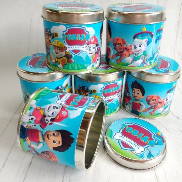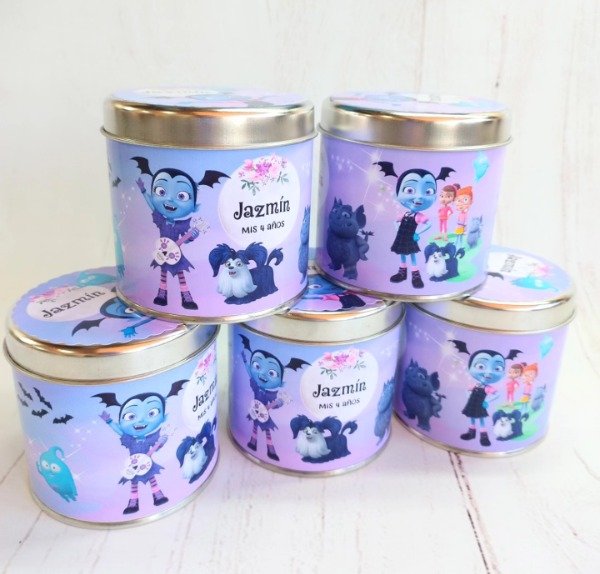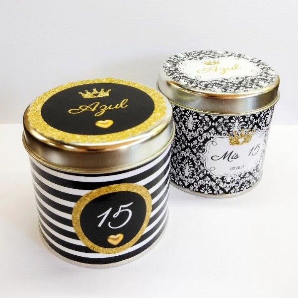 Un envase metálico de mayor capacidad, versátil y de alta calidad, totalmente personalizado con el diseño de tu evento. Ideal para rellenar con golosinas, jabones u otros detalles.
